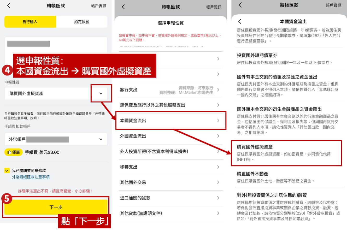 打開幣安App,將對應的資訊複製到將來銀行 (幣安每個資訊的最右邊正方形符號就是複製) → 申報性質選本國資金流出的「購買國外虛擬資產」→ 打勾同意條款 → 點「下一步」: