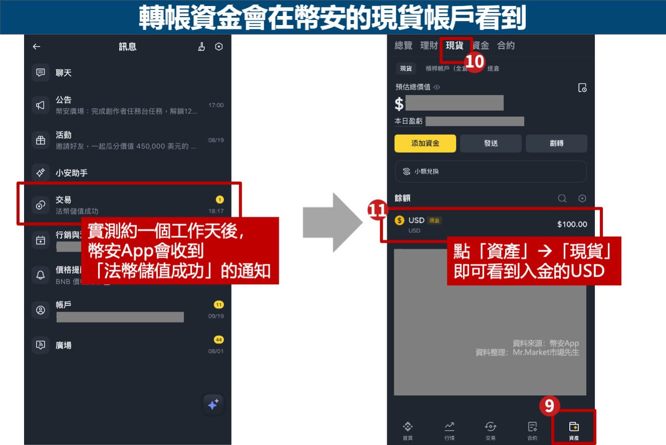 收到通知後,登入幣安App → 點「資產」→「現貨」,就會看到到帳的USD: