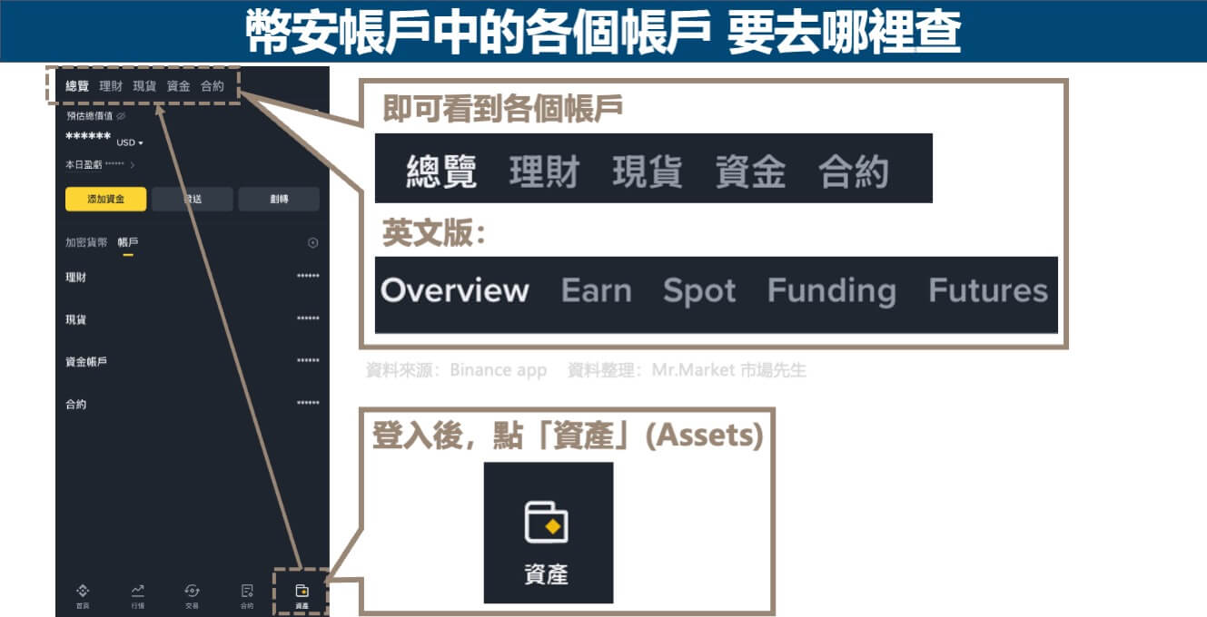 本篇市場先生將介紹幣安錢包的各個帳戶,分別是理財、現貨、資金、合約帳戶。使用幣安App手機版可在「資產」按鈕看到這些帳戶,電腦版則是在「錢包總覽」按鈕會看到。