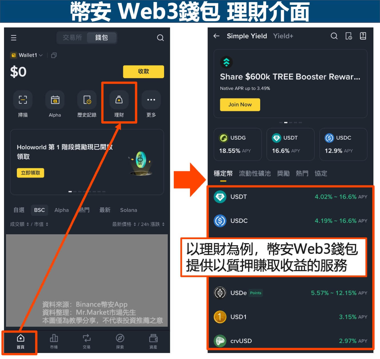 上述的現貨帳戶/資金帳戶的兌換、理財帳戶的活期/定期申購等等,幣安Web3也都有提供類似的服務,以下以理財為例: