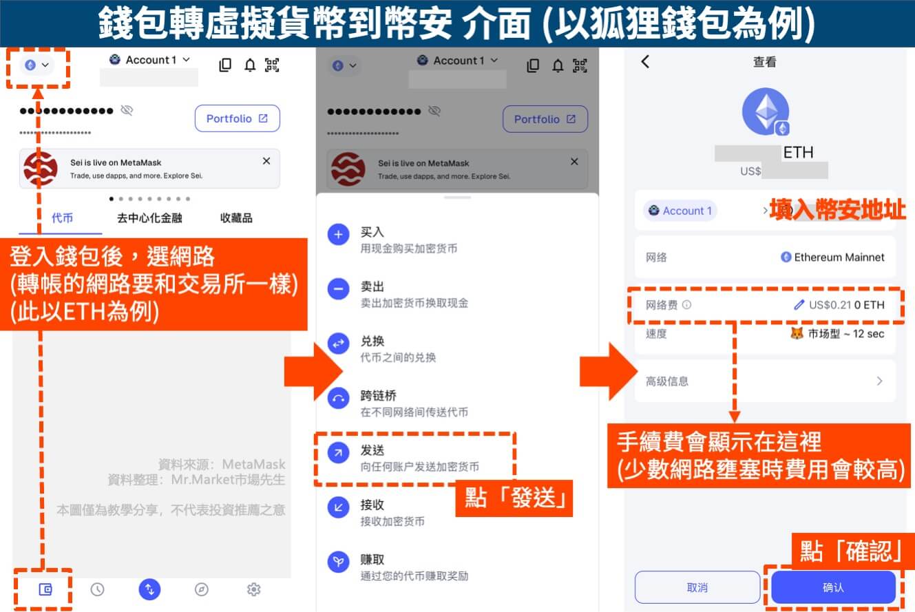 市場先生有分享狐狸錢包轉交易所的圖解步驟,有需要可參考:Metamask(狐狸錢包)轉到幣安