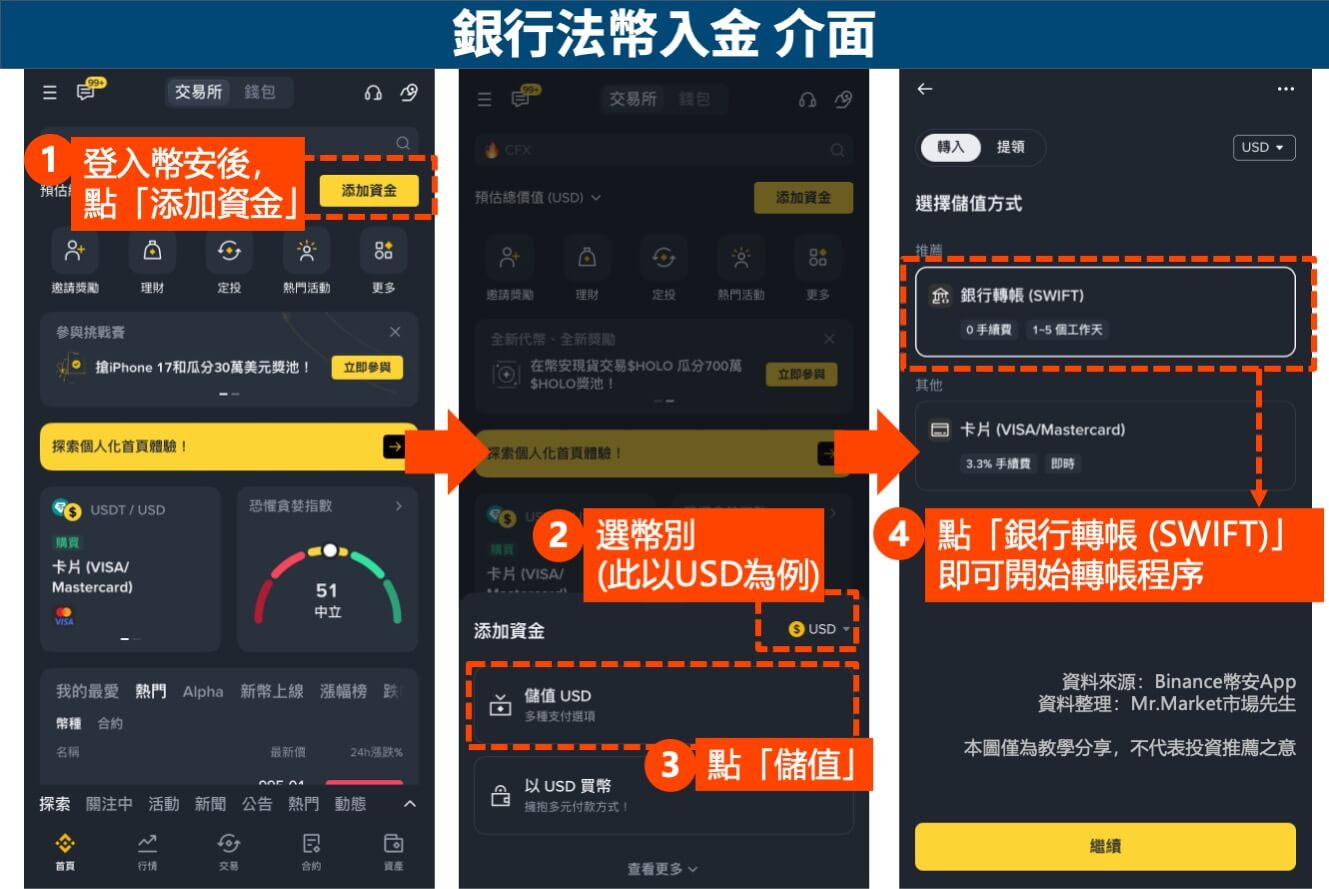 3. 銀行帳戶電匯法幣到幣安,法幣再買虛擬貨幣 → 限指定幣別/限額,適合大額入金
