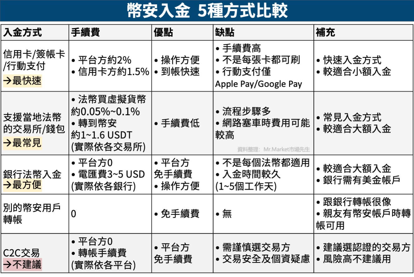 本篇市場先生將介紹幣安入金的5種方式,及它們的手續費、優缺點。