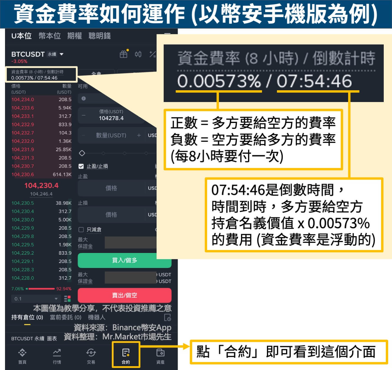 以下介紹合約交易的資金費率機制,會用全球最大的幣安交易所APP介面做舉例。同時也談一下資金費率套利策略的運作邏輯是什麼。