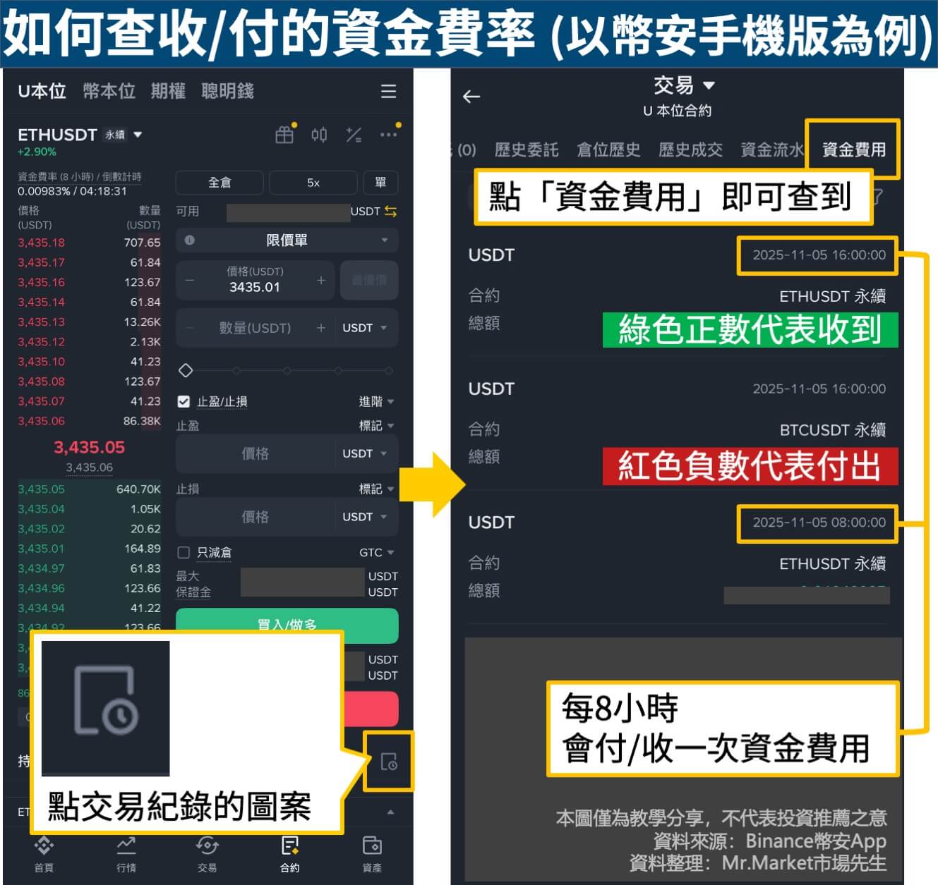 綠色正數代表收到的資金費用,紅色負數代表付出的資金費用,收到/付出的會從合約帳戶裡自動入帳/扣掉。
