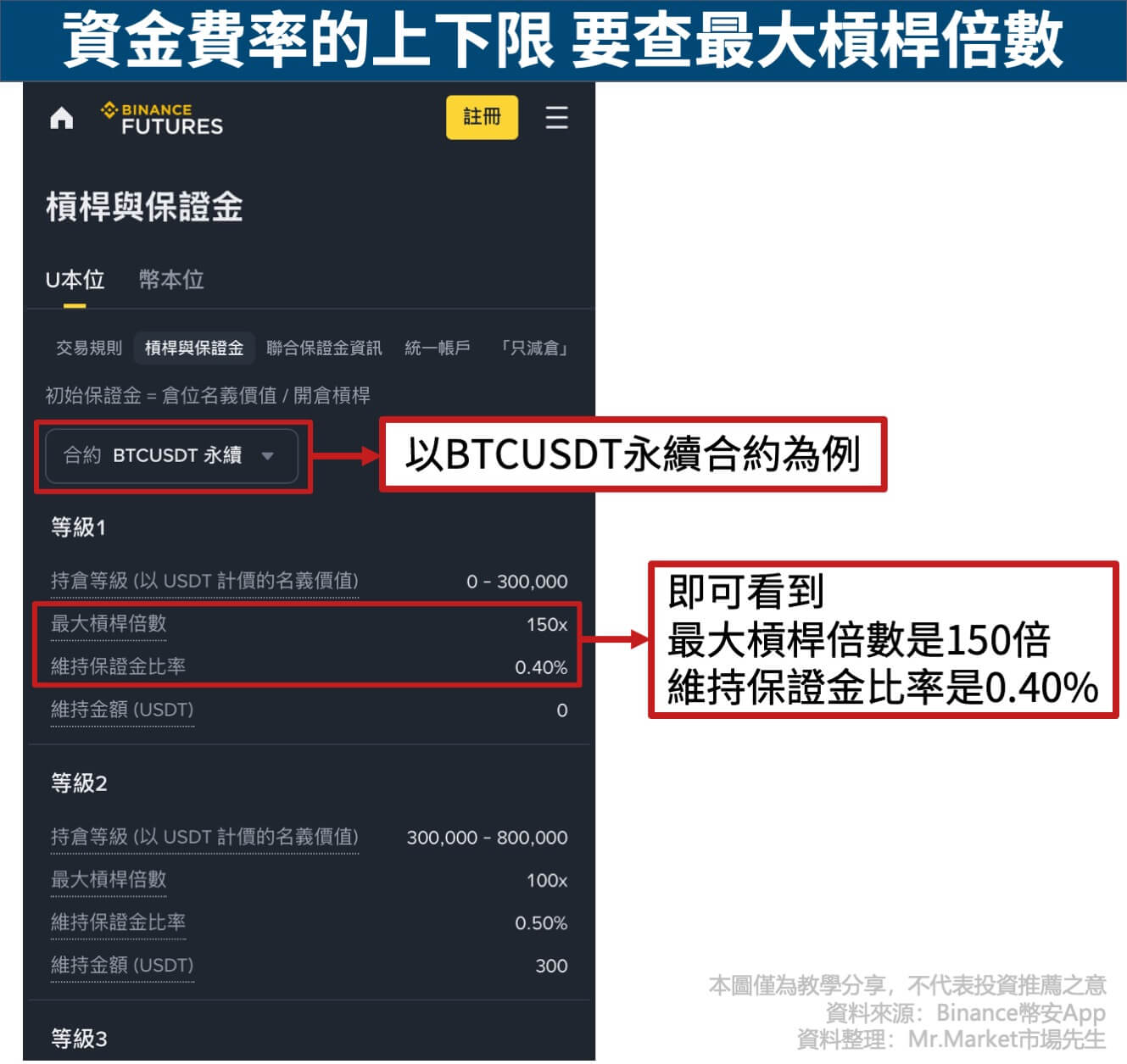 每個合約的最大槓桿倍數可幣安的槓桿與保證金頁面查到,例如BTCUSDT最大槓桿倍數是150倍 (如下圖),