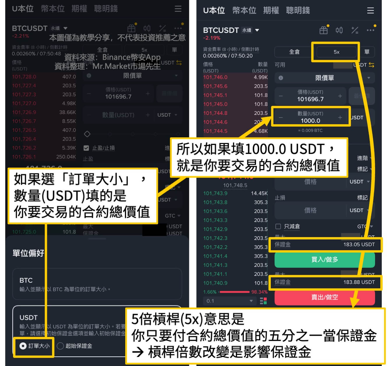 如果選「訂單大小」,下單時要輸入的數字是「想交易的合約總價值」,這裡的槓桿倍數影響的你要拿出的保證金。