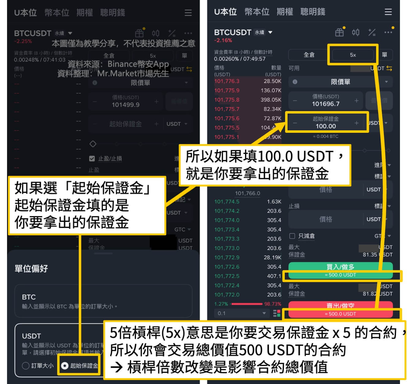 例如下圖我在起始保證金填100 USDT 就是我要拿出的保證金,如果設定5倍槓桿,代表我要交易的是保證金 x 5 = 500 USDT的合約: