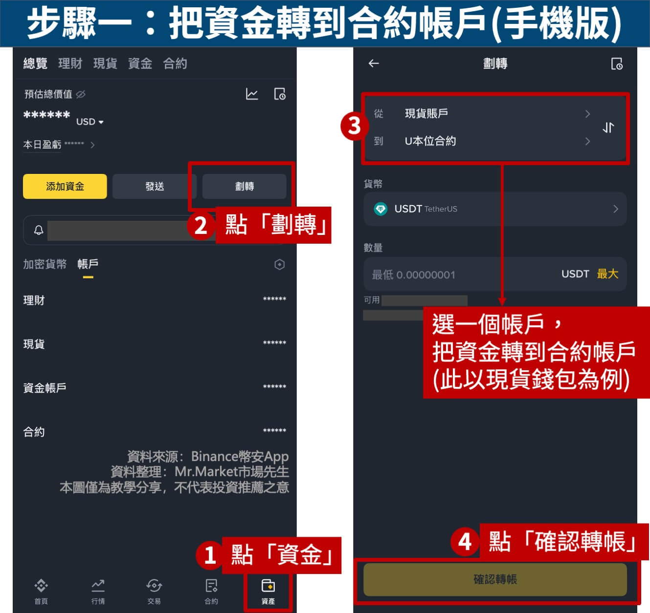因此合約交易時,必須把其他帳戶的錢轉帳到合約錢包帳戶,