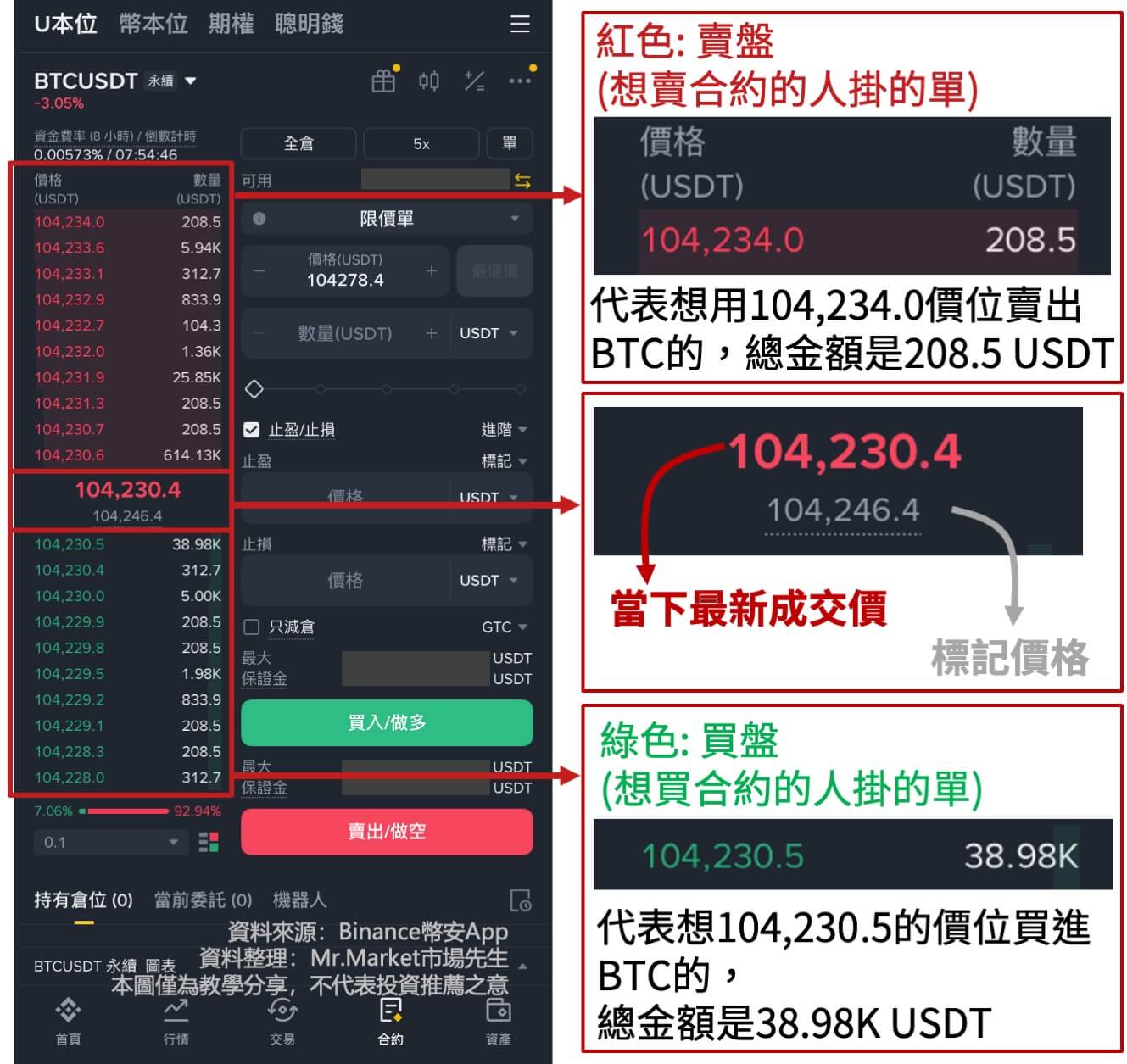 | 紅色 (賣盤) | • 例如104,234.0 的數量是208.5(USDT),代表有人想用104,234.0這個價位賣出BTC,這些人想賣出的總金額是208.5 USDT • 如果賣壓強(一堆人想賣),價格就會一直往下掉 |