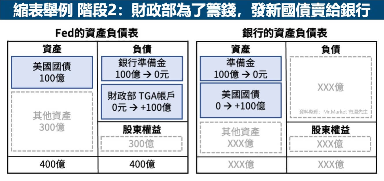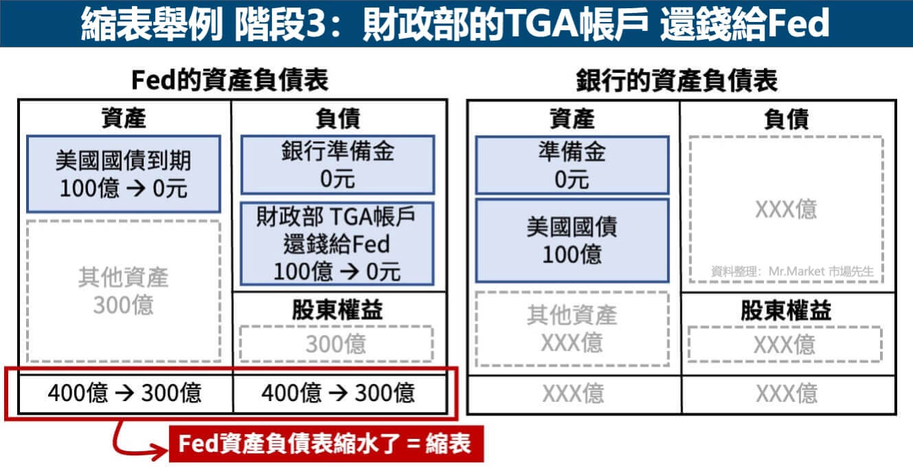 財政部用TGA帳戶的100億來還給Fed,TGA帳戶會歸零,Fed持有的國債資產也會歸零,等於Fed的資產跟負債同時減少,達到縮表的目標。