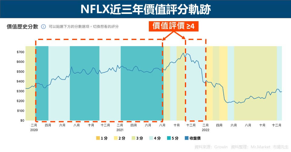 同樣舉個範例,NFLX在2022年7月、9月、10月及12月,都曾經短暫出現波段評價5分的訊號。