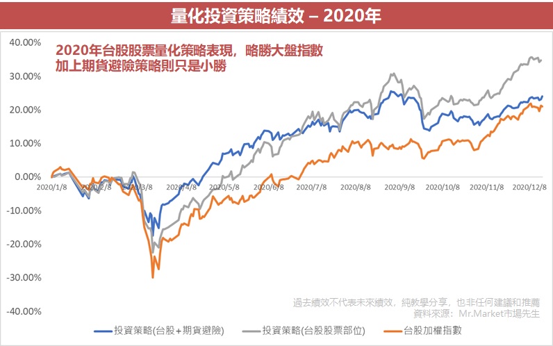 不過由於我們有另外加入一組期貨避險策略,目的是減少空頭的波動,整體個股+期貨(藍色線)大約是+24%,僅是小勝。