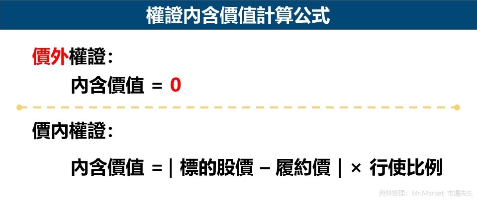- 價內權證:在當下假設立即被履約,存在被履約的價值;因此內含價值等於標的股價和履約價的價差,先取絕對值之後,再乘以行使比例。