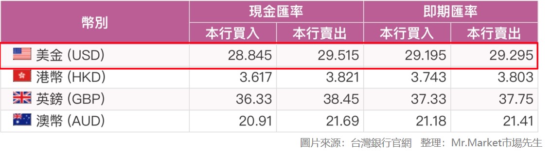 以現金匯率為例,1美金銀行用28.845台幣跟你買,但1美金銀行用29.515台幣賣你