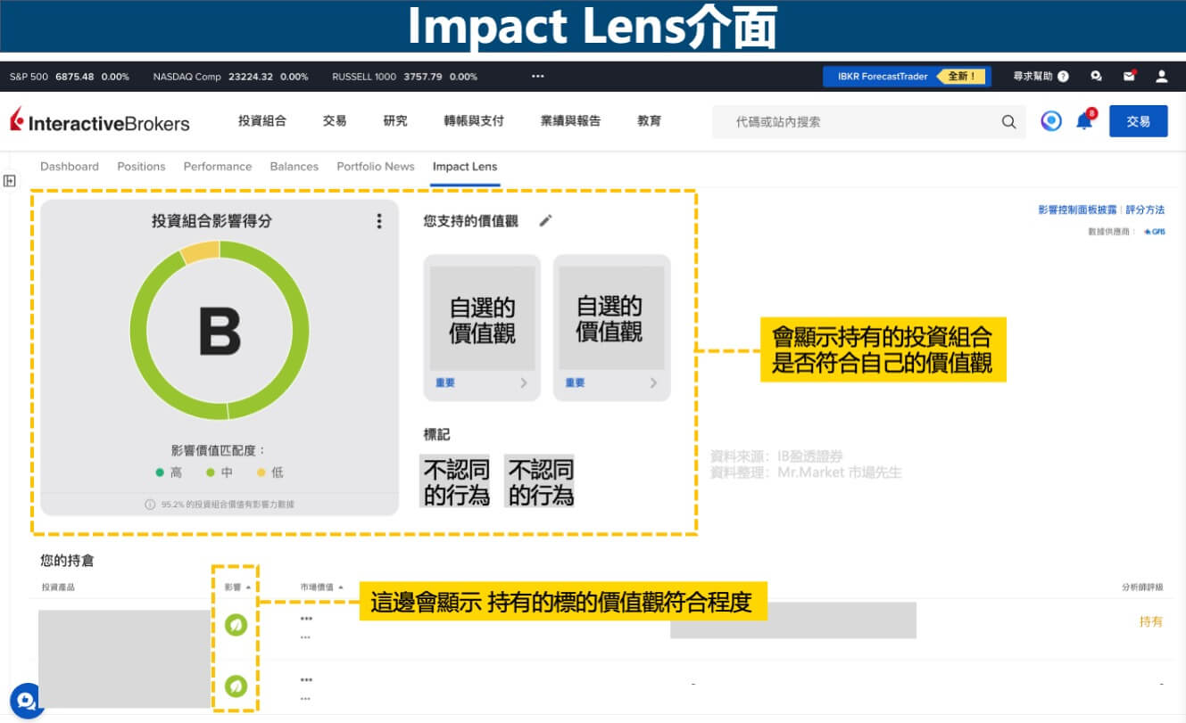 在Portfolio News右邊,有個功能叫做「Impact Lens」,這可能類似IB在這次改版以前的「IMPACT控制面板(IMPACT Dashboard)」,可檢視自己的投資組合是否符合自身的價值觀。