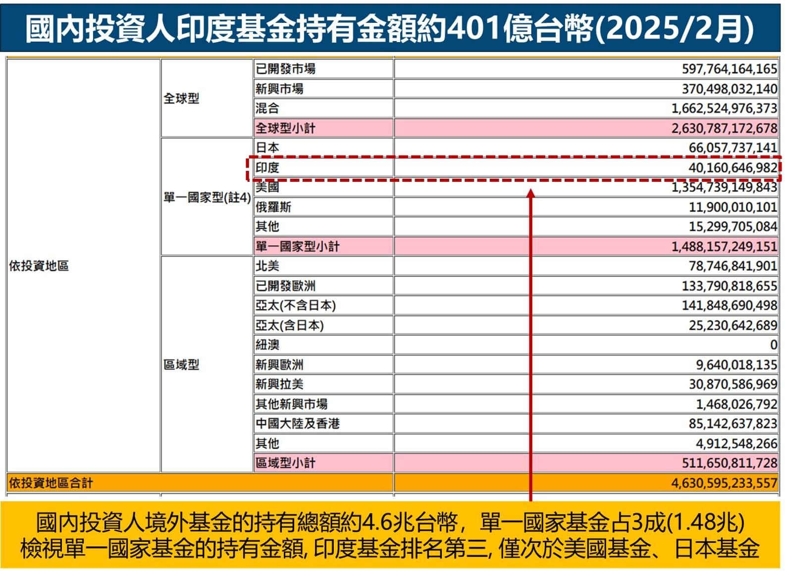 在單一國家型的境外基金中,印度基金持有金額約台幣401億,排名第三,僅次於美國基金、日本基金。