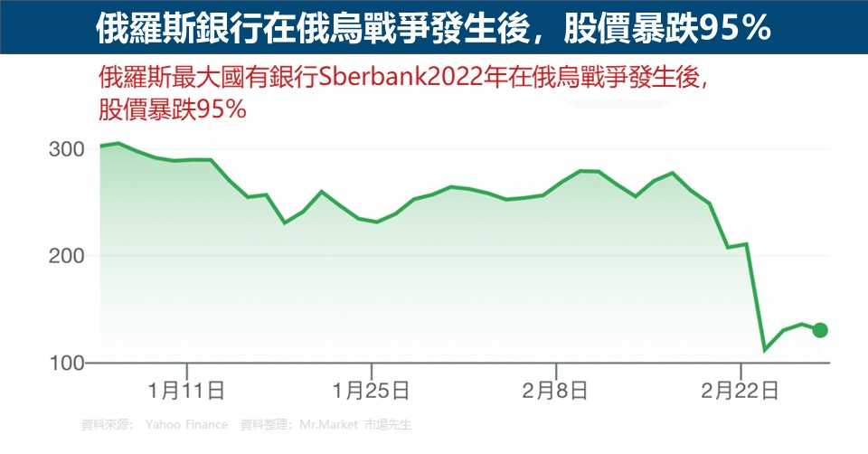 俄羅斯最大的國有銀行Sberbank是全球排名前100的銀行,但在2022年2月烏俄戰爭發生後,發生民眾瘋狂擠兌風險,股價在幾天內暴跌50%,俄羅斯宣布股市關門休市,甚至在海外交易所還一度交易價低至0.01美元。