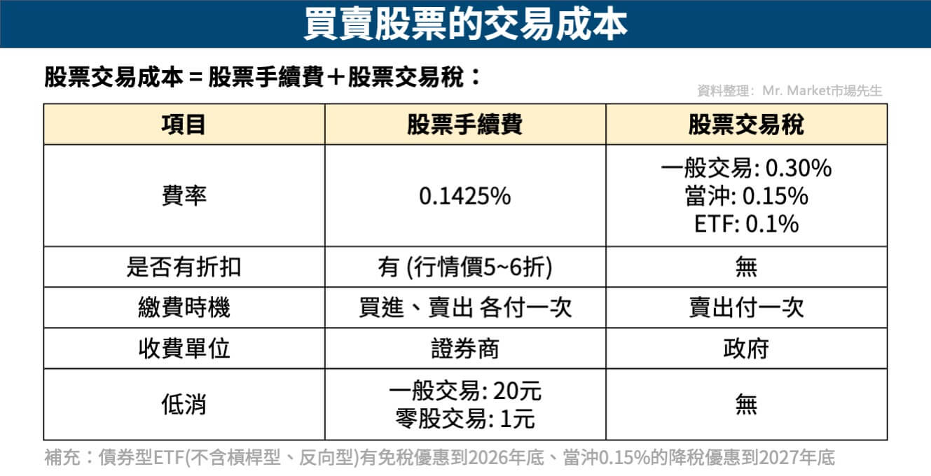 股票交易成本包含「股票手續費」及「股票交易稅」,買進/賣出股票都要付0.1425%的股票手續費(再乘上各券商給的折扣),賣出股票需再付0.3%的股票交易稅 (如果投資ETF交易稅是0.1%)。
