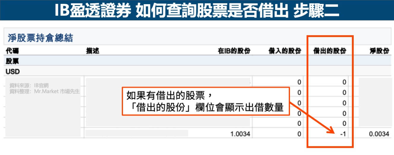 其中,在「淨股票持倉總結 (Net Stock Position Summary)」欄位,可以查看被借出的股票: