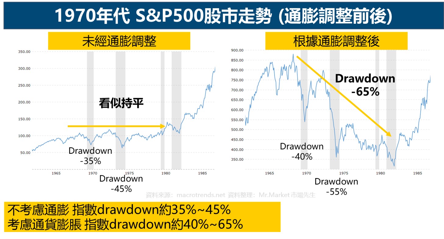 如果我們打開歷史走勢圖觀察S&P500指數,實際上1970年代的股市雖然有波動及回檔,但整個1970~1980年代下跌並不顯著 (如下圖左),